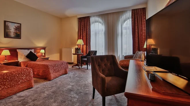 Ve čtyřech křídlech hotelu jsou rozmístěny krásně zařízené pokoje s manželskými postelemi, které lze spojit i rozdělit podle potřeby. Ubytujete se v dvoulůžkovém pokoji Standard nebo dvoulůžkovém pokoji Premium s možností dvou přistýlek. Ve všech můžete počítat s koupelnou vybavenou sprchovým koutem, ručníky, fénem a sadou kosmetiky, ale také s TV, trezorem, minibarem a rychlovarnou konvicí. Většina pokojů má také balkon s výhledem na Tatry.