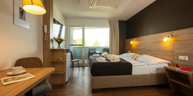 Vybrat si můžete přesně takový typ ubytování, jaký vám nejvíce vyhovuje – od útulných studií až po prostorné apartmány pro rodiny či skupiny. Studio o rozloze 21–25 m² je ideální pro dvojici, disponuje pohodlnou manželskou postelí, kuchyní s jídelním koutem a nabízí také možnost jedné přistýlky.