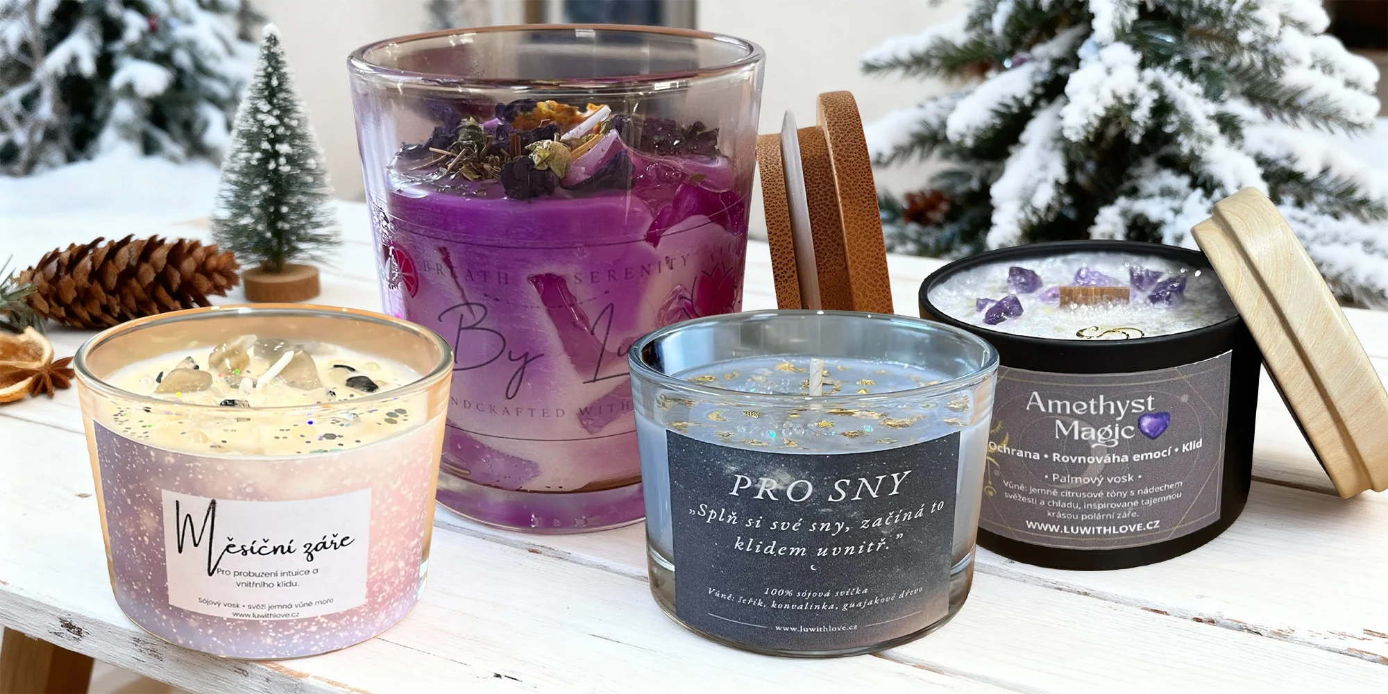 Ponořte se do voňavého světa svíček LuWithLove, které se vyrábí v České republice. Každý kousek je odlitý ze 100% přírodního sójového či palmového, případně i gelového a kokosového vosku, ukrytý ve skle, které se bude krásně vyjímat na vašem stole, poličce nebo nočním stolku. Některé vás navíc potěší i dřevěným knotem, který při hoření připomíná praskající krb.