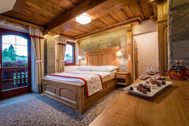 Ubytujete se v komfortním dvojlůžkovém pokoji zařízeném v tatranském stylu. Za výhled na hory si můžete připlatit, klid a ticho jsou tu v ceně vždy. Dvojlůžkový pokoj bez přistýlky je ideální pro páry, které hledají útulný prostor s manželskou postelí, balkonem, minibarem, trezorem a TV.