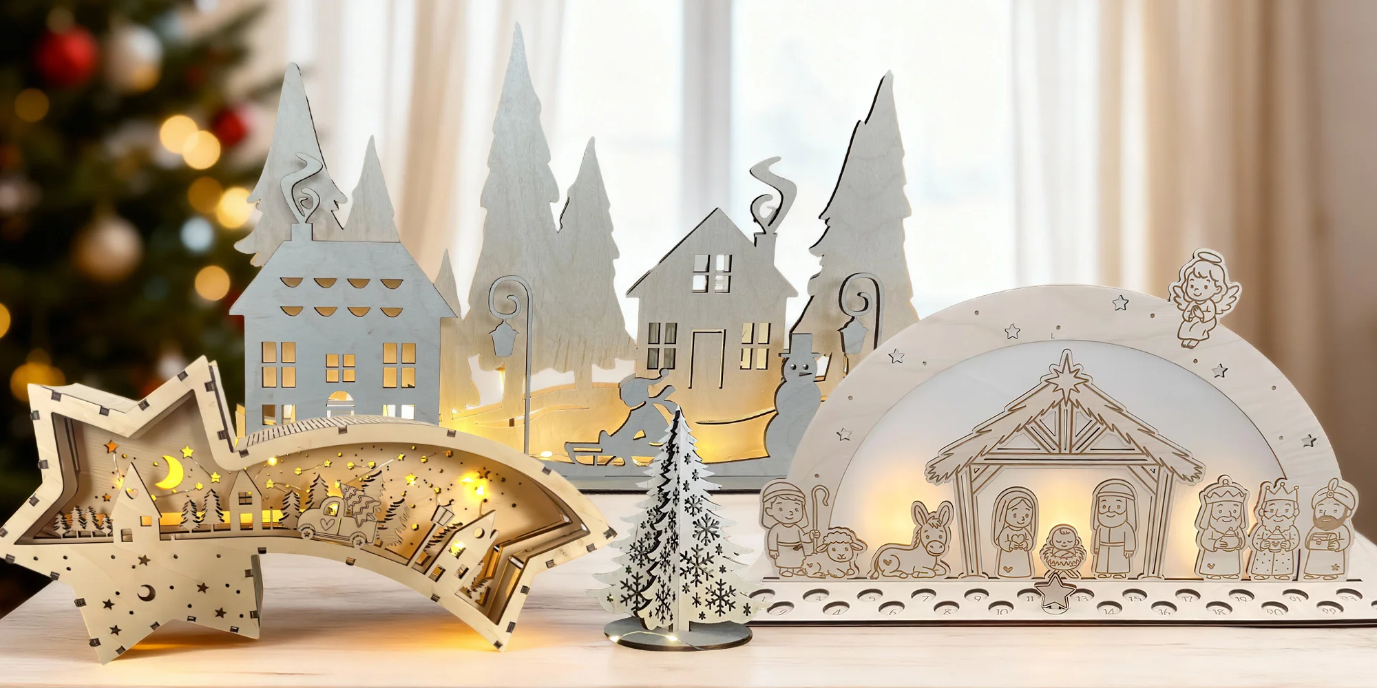 Vyšperkujte letošní Vánoce k dokonalosti. Míse cukroví, Popelce a voňavému františkovi už schází jen krásná vánoční dekorace z dřevotřísky, která (dle varianty) doslova rozsvítí celý obývák. Na okenní parapet i poličku vedle telky pořídíte svítivou lucernu, svícen ve tvaru komety nebo vánoční vesničku.
